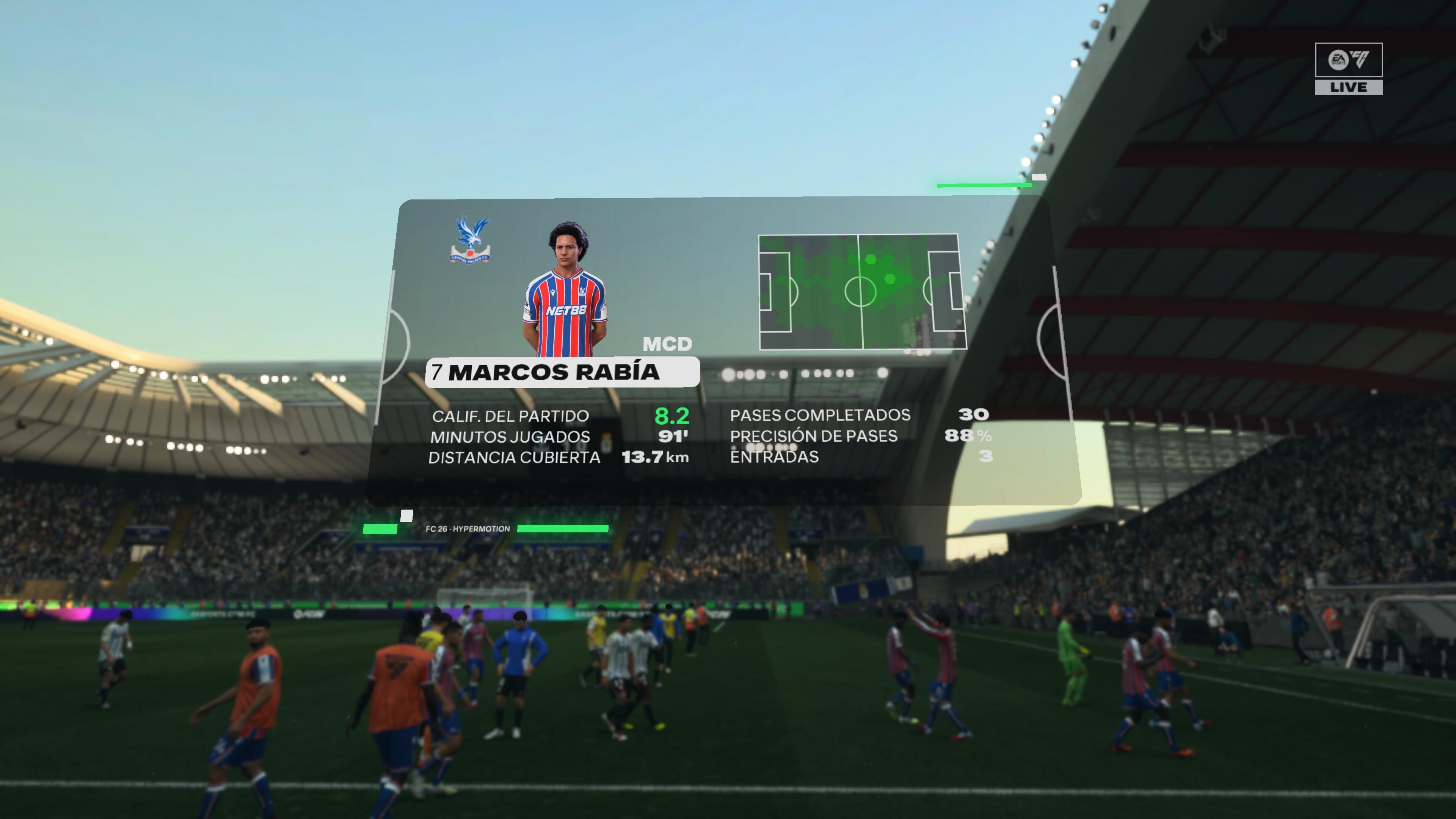 EA SPORTS FC 26 ofrece un despliegue visual interesante, con detalles gráficos que notan la diferencia en los jugadores y la cancha cuando cambia el clima, por ejemplo, viéndose mojados si llueve o un pasto seco y tupido si el sol es intenso. Y aunque se muestra correctamente y no notamos fallos agresivos en el juego, no llega por ser espectacular para lo que ofrecen más juegos de la generación.